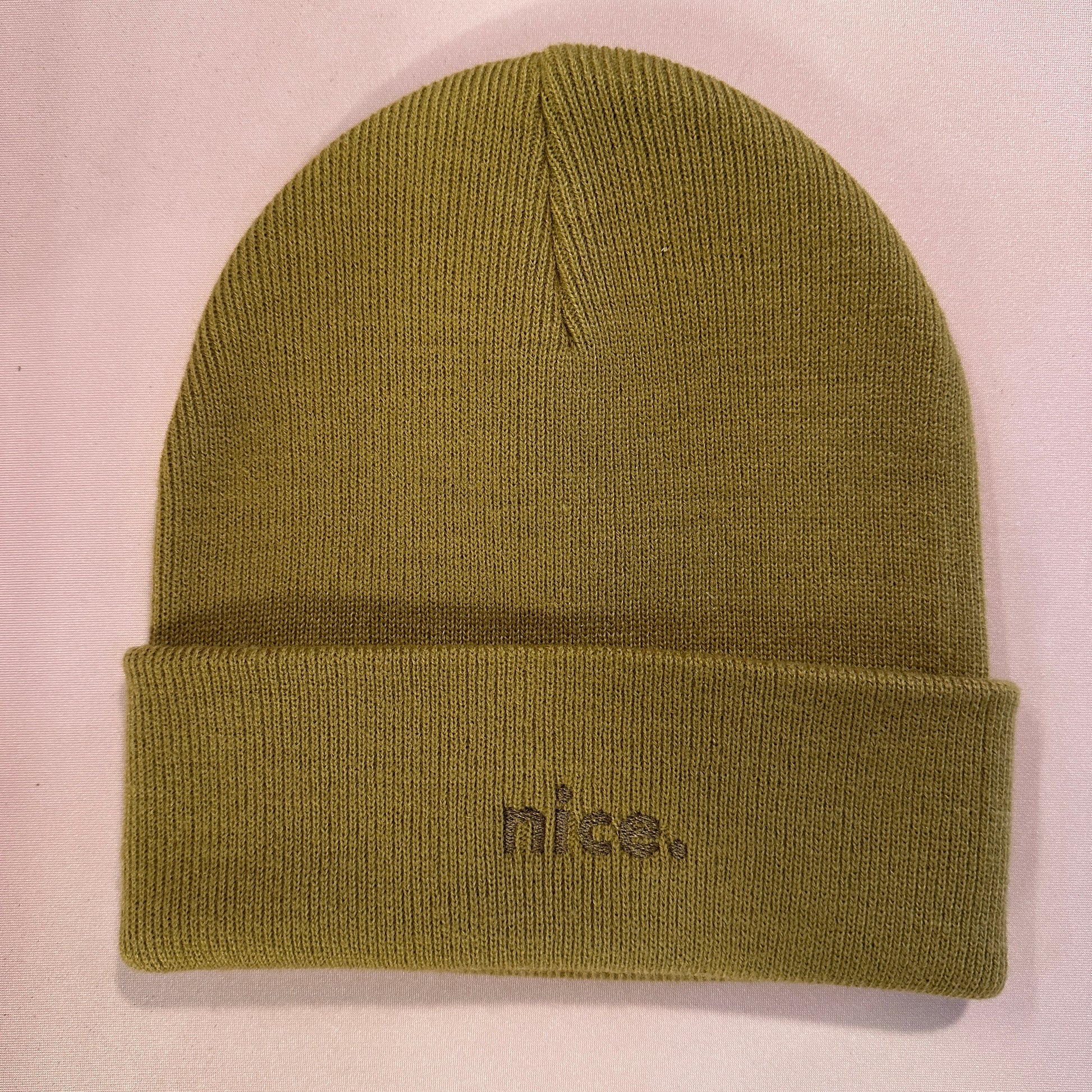 Verleih deinem Outfit eine natürliche Note mit unserer braunen Beanie, die das entspannte Statement „nice.“ trägt.