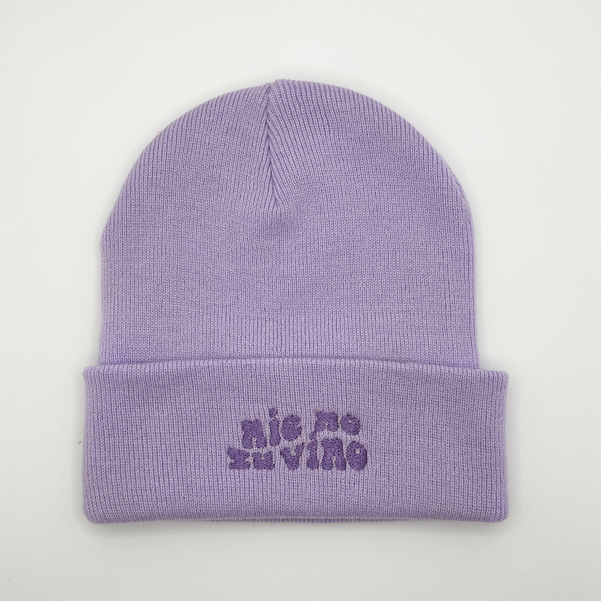 Beanie Mütze in Flieder mit Stick „Nie no zu vino.“