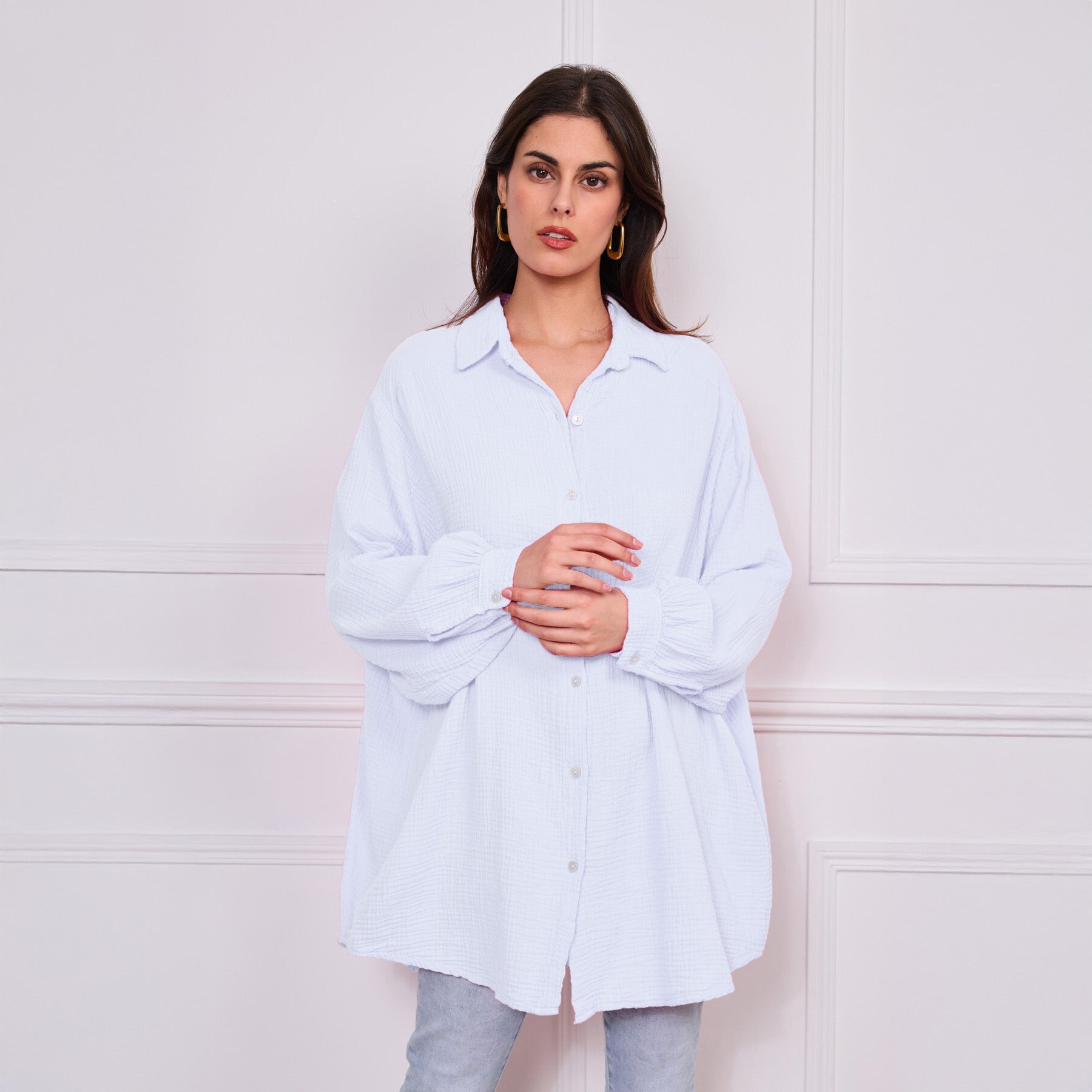Hol dir den absoluten Wohlfühlfaktor! Hier kommt unsere lange Oversize-Bluse aus softem, leichtem Musselin. Wenn du es lässig und trotzdem stilvoll magst, ist dieses Teil wie gemacht für dich.