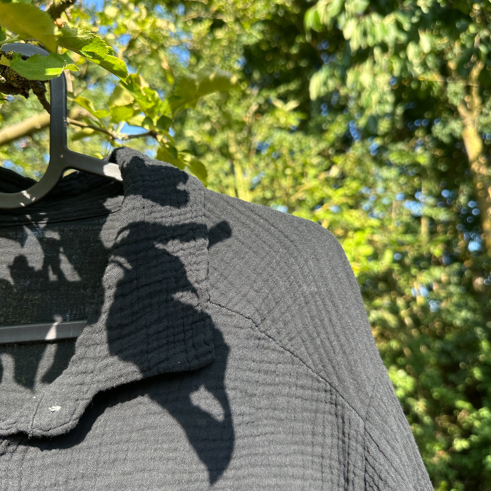 Du suchst ein vielseitiges Sommer-Piece, das immer chic aussieht? Hier ist Nora, unsere kurze Oversize-Bluse aus softem Musselin, jetzt in elegantem Tiefschwarz.