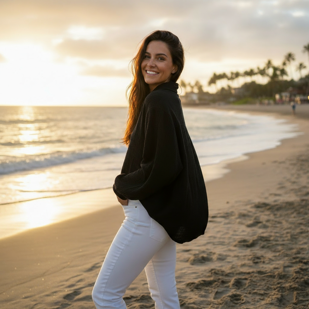 Schwarz ist ein zeitloser Klassiker, der sich mühelos stylen lässt. Ob elegant am Abend, lässig im Alltag oder als Kontrast zu hellen Sommer-Basics – diese Bluse passt immer.